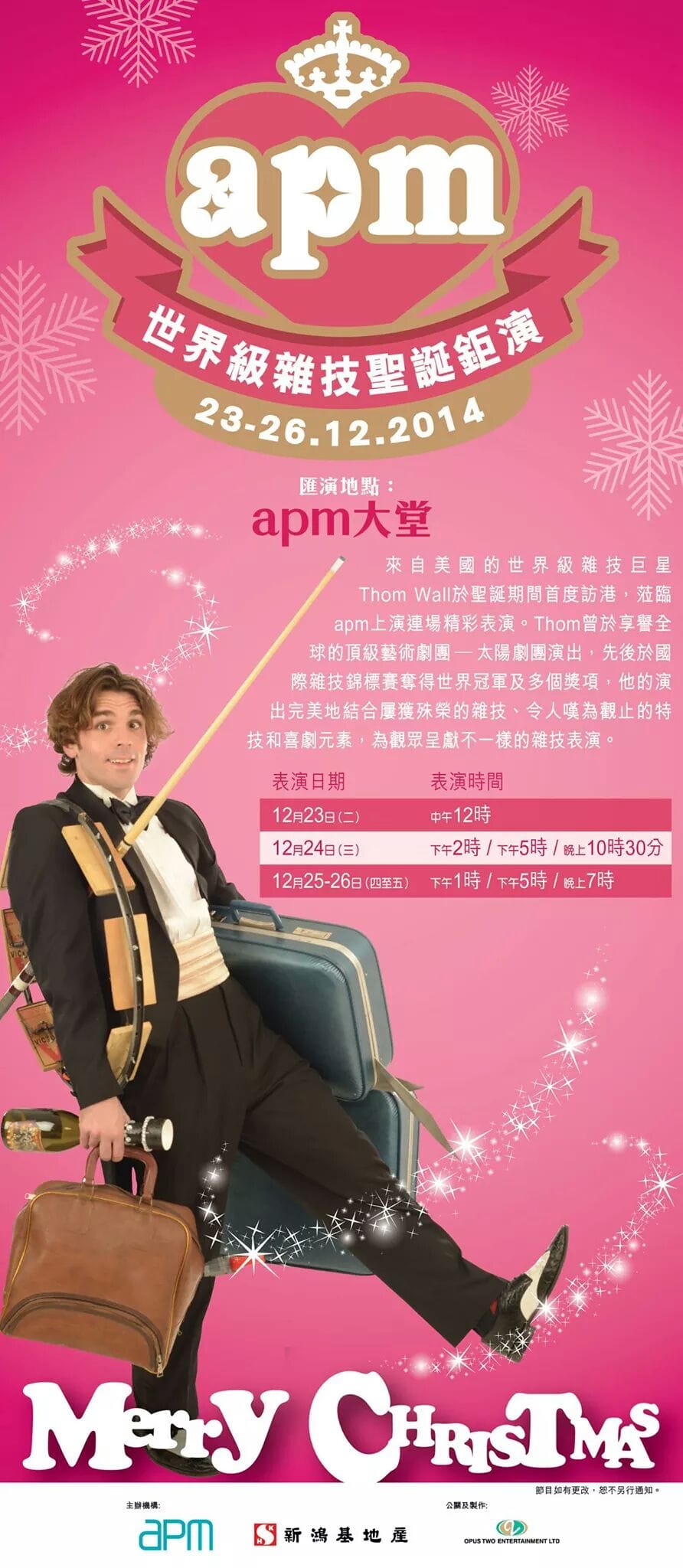 来自美国的世界级杂技巨星Thom Wall 于圣诞其间首度访港,莅临apm上演连场精彩表演。 Thom曾于享誉全球的顶级艺术剧团-太阳剧团演出,先后于国际杂技锦标赛夺得世界冠军及多个将项,他的演出完美地结合屡获殊荣的杂技,令人叹为观止的特技和喜剧元素,为观众呈仙不一样的杂技表演。